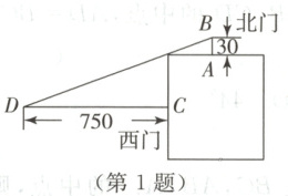 1. 我国古代数学著作《九章算术》中记载了一个问题:“今有邑方不知大小,各开中门,出北门三十步有木,出西门七百五十步见木,问:邑方几何?”其大意是:如图,一座正方形城池,A 为北门中点,从点 A 往正北方向走 30 步到 B 处有一树木,C 为西门中点,从点 C 往正西方向走 750 步到 D 处正好看 到 B 处的树木,则正方形城池的边长为
