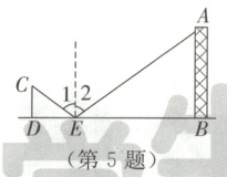 5. 如图,小明在地面上放置一个平面镜 E 来测量铁塔 AB 的高度,镜子与铁塔的水平距离 EB=20 m,镜子与小明的距离 ED=2 m 时,小明刚好从镜子中看到铁塔顶端 A. 已知小明的眼睛距地面的高度 CD=1.6 m,求铁塔 AB 的高度.