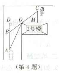 4. 如图,某小区内的一段小路上,有一个儿童在 2 号楼一侧的 C 处玩耍,此时有一辆小轿车从 2 号楼 另一侧的 A 处驶来. 已知 CM⊥DM 于点 M,点 D 在 AB 延长线上,BD⊥DM 于点 D,BC 与 DM 交于点 O,OM=4 m,CO=5 m,DO=3 m,AO=√73 m,则汽车从 A 处前行的距离 AB =
