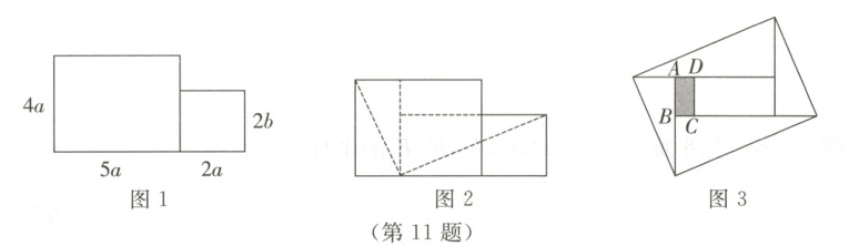 11. 将图1中的矩形和正方形纸片沿图2中的虚线剪成5块,再用这5块拼接成如图3所示的矩形,其中阴影部分为空余部分,若$AB = 2AD$,则$\frac{b}{a}$的值为