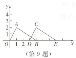 9. 如图,点$A$,$B$的坐标分别为$(1,2)$,$(4,0)$,将$\bigtriangleup AOB$沿$x$轴向右平移,得到$\bigtriangleup CDE$,已知$DB = 1$,则点$C$的坐标为