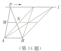 14. 如图,直线$l//AB$,$P$是$l$上的动点,$M$,$N$分别为$PA$,$PB$的中点,给出下列各值:①线段$MN$的长;②$\bigtriangleup PMN$的周长;③$\bigtriangleup PMN$的面积;④四边形$ABNM$的面积;⑤$\angle APB$的大小.随点$P$的运动,不变的是