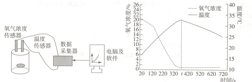 10.铁生锈的原理能用于制作“暖宝宝”。某“暖宝宝”的成分为铁粉、蛭石(保温作用)和吸水性树脂、食盐、活性炭。探究小组利用左图装置进行探究,实验结果如图。下列说法错误的是