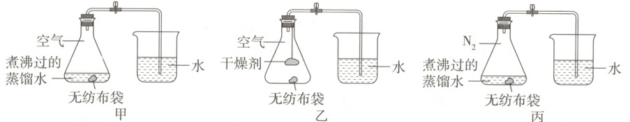,打开无纺布袋,发现有部分黑色粉末变成了红棕色。乙图、丙图所示的实验无明显变化,对比甲图和丙图说明铁生锈的条件是