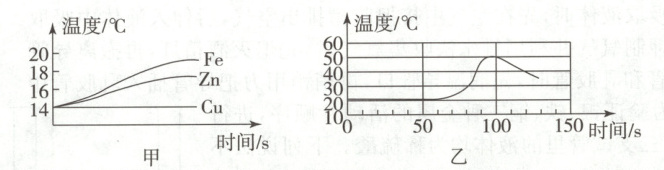 取表面积大小相同的三种金属片,分别加入足量相同的三份稀盐酸中,并用温度传感器测定反应过程中的温度变化,所得温度变化曲线如图甲所示。