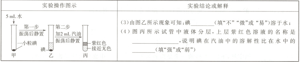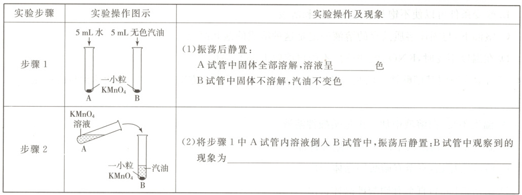 3.为了探究相同条件下同种溶质在不同溶剂中的溶解性,某兴趣小组同学进行如下两组实验。(提示:本实验所用汽油与$\mathrm{KMnO_4}$、碘均不发生化学反应)