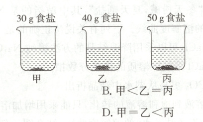 7. 已知$20\ ^{\circ}C$时,氯化钠的溶解度为36 g。在$20\ ^{\circ}C$时小明在甲、乙、丙三个相同的杯子中各注入100 g蒸馏水,然后分别加入30 g、40 g 和50 g 食盐(如图)。充分溶解后这三杯溶液的溶质质量分数大小关系为