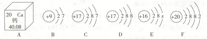 ;(4)图 F 是钙元素的原子结构示意图,则钙离子的符号为