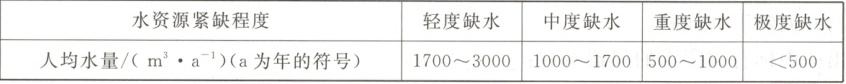 (1)山东人均水量为$411 \mathrm{m^3 · a ^{-1}}$,远远低于全国人均$2350 \mathrm{m^3 · a ^{-1}}$的水平,水资源紧缺程度为