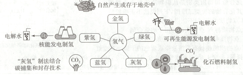 14. 加快能源转型升级,发展新质生产力。氢气是最理想的清洁能源,依据不同制取方式,可分为“绿氢”“灰氢”“蓝氢”“紫氢”和“金氢”等。如图带你认识“多彩”的氢。