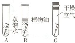 上覆盖植物油,C 试管内是干燥的空气。(每支试管中均放有相同的铁钉)