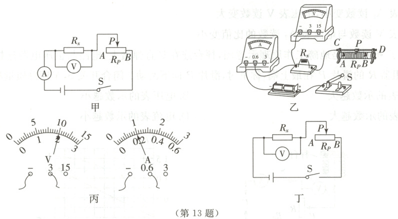 13. (2024·遂宁)老师带领芳芳所在的班到实验室进行分组实验,利用两节干电池、电流表、电压表、滑动变阻器(最大阻值为$R_P$)等器材测量未知电阻$R_x$的阻值,实验所用的电路如图甲。