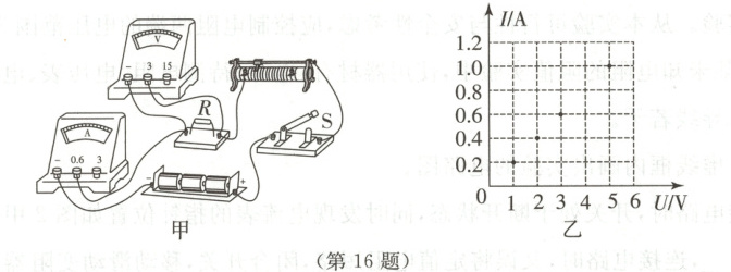 16. 小明和小华同学在“探究电流与电压的关系”的实验中,电源使用三节新干电池,滑动变阻器的规格是“$10\ \Omega,2\ A$”、“$25\ \Omega,2\ A$”、“$50\ \Omega,0.5\ A$”。
