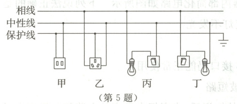 5. 在家庭电路中,如图所示的有关电灯、开关和插座的连线正确的是 (
