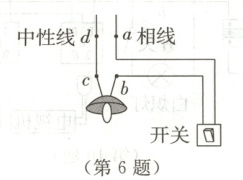6. 如图所示电路,开关闭合后,灯不发光。用测电笔接触$a$、$b$、$c$三处,氖管都发光;接触$d$处,氖管不发光。则故障可能是 (