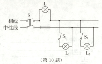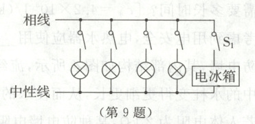 9.学习家庭电路后,小亮把自己家客厅的电路绘制了一个简单的电路图(如图所示),如果他先闭合开关$S_1$,让电冰箱开始工作,然后依次闭合灯泡开关,那么 (
