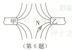 6. 甲、乙为不同条形磁体的两个磁极,弧线是部分未标方向的磁感线,如图所示。根据图中小磁针静止时的指向判断甲、乙的磁极,下列描述正确的是 (