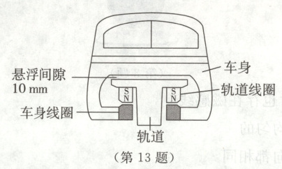 13. 如图所示是某种磁悬浮列车示意图,轨道线圈上端是 S 极,要使列车悬浮起来,车身线圈上端应是
