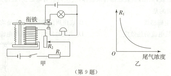 9.(多选)(2024·威海)图甲是一种汽车尾气排放检测电路。当尾气浓度高于某一设定值时,电铃报警;气敏电阻$R_1$的阻值与尾气浓度之间的关系如图乙所示,下列分析正确的是