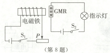 8. 如图是说明巨磁电阻特性原理的示意图,其中 GMR 是巨磁电阻,它的阻值随磁场的增强而减小。实验时,当开关$S_1$、$S_2$均闭合且滑片 P 向左滑动的过程中