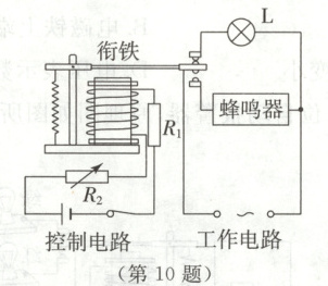 B.温度升高过程中,R₁变小,电流变大,电磁铁磁性增强,吸附衔铁,蜂鸣器报警,故B正确;
