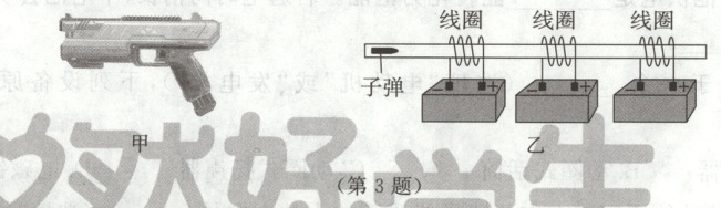 3. 小晋在航展上看到一款电磁枪(如图甲所示),它的能量来自电磁线圈,图乙是其原理图。当线圈中瞬间通入强大电流时,产生的磁力就会将铁做的子弹弹射出去,子弹进入线圈中间位置时断电,继续运动进入下一个线圈,从而不断加速。下列说法正确的是(