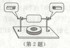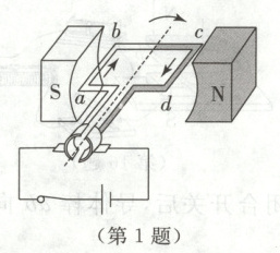 2. 图中是小亮制作的简单电动机模型,其线圈由漆包线绕成,将线圈一端的漆全部刮掉,另一端只刮掉半周,在线圈的下面放置了一块磁体。将其接入电路中,给线圈通电并用手轻轻推动一下,线圈转动起来了。关于此电动机模型的说法正确的是(