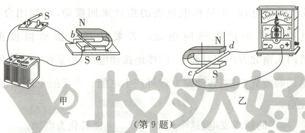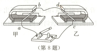 8. 如图所示,甲、乙两个相同的装置分别由蹄形磁体、导体棒和支架构成,导体棒$ab$和$cd$由导线连接。闭合开关并向右移动$ab$,$cd$也会随之向右移动,对于以上现象,分析正确的是 (