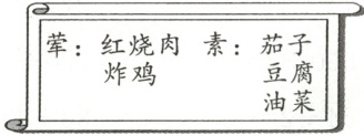快餐店规定:一份盒饭可以配一个荤菜和一个素菜。星期二一共有多少种不同的配菜方法?请你写出来。(4分)