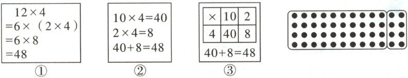 8. 在计算“$12×4 = ?$”时,同学们想到了下面3种方法。如图这个点子图可以用