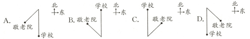 4.三(1)班的劳动课上,李老师带领同学们去附近的敬老院参加志愿者服务、帮助老人们做一些力所能及的事。他们从学校出发、先向南走,再向西北方向走到敬老院。下图中符合描述的是(
