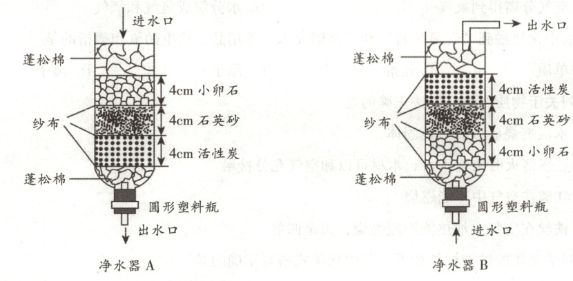 (2) 应急情况下,我们可以用生活中常见的物品制作简易的净水器,对自然界中的水进行初步净化。研究小组制作了两个简易净水器如图所示,同样净化50mL浑浊的天然水,下列说法正确的是