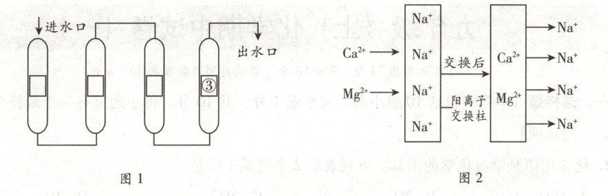 →③→出水口;除过滤膜、活性炭之外,离子交换树脂也常用过滤介质,可用阳离子交换树脂对硬水水样进行软化,其原理如图2,当硬水通过树脂时,水中的$Ca^{2+}$、$Mg^{2+}$