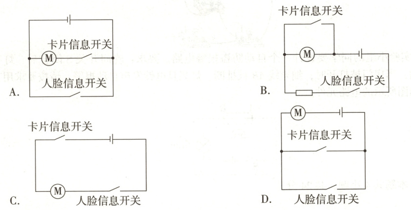 3. 门禁系统可以通过刷脸也可以通过刷卡开门,当卡片信息或人脸信息符合时,电动机转动打开闸门。下列能达到这种效果的电路图是(