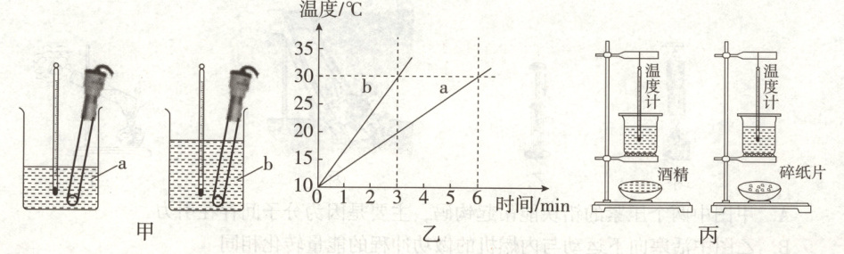。[水的比热容为$c_{水}=4.2×10^3\ J/(kg·^{\circ}C)$](2)如图丙所示,为比较酒精和碎纸片的热值,用两只同规格的烧杯装相等质量的水,取质量相等的酒精和碎纸片,分别放入两个燃烧皿中,点燃给烧杯加热,直到酒精和碎纸片完全燃烧完,通过比较来比较酒精和碎纸片热值的大小。