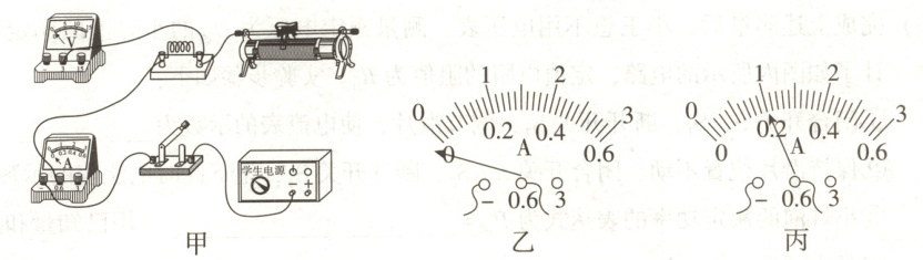 (3)小王先接入$15\ \Omega$的电阻,调节滑片使电压表示数为3 V,观察到电流表示数如图丙所示,则电流表示数为