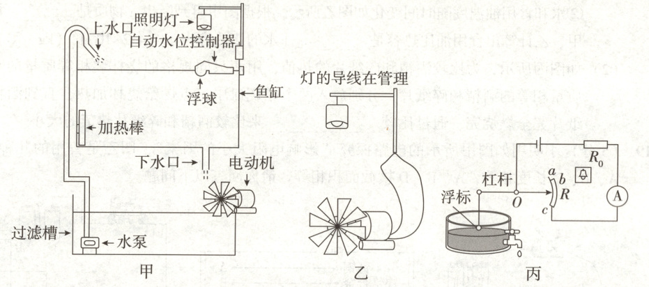 ①如图丙所示,这是底滤槽水位监控器。其中$R_0$是一个定值电阻,a是金属球,ab之间是绝缘的,R是滑动变阻器的电阻片(b、c为电阻片的两端),滑动变阻器的滑片跟滑杆连接,滑杆可以绕固定轴O转动,另一端固定着一个浮子。当水面升高时,电流表示数会
