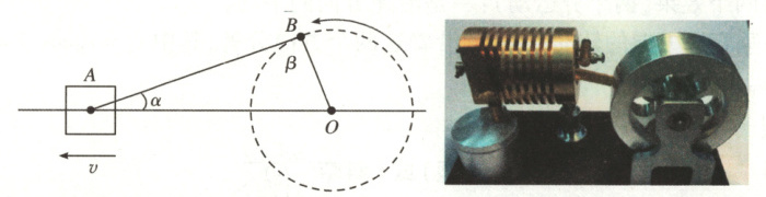 跟踪训练 5:(2025·陕西咸阳高一阶段练习)如图所示,斯特林发动机的机械装置可以将圆周运动转化为直线上的往复运动。连杆$AB$、$OB$可绕图中$A$,$B$,$O$三处的转轴转动,连杆$OB$长为$R$,连杆$AB$长为$L$($L > R$),当$OB$杆以角速度逆时针匀速转动时,滑块在水平横杆上左右滑动,连杆$AB$与水平方向夹角为$\alpha$,$AB$杆与$OB$杆的夹角为$\beta$。在滑块$A$从右向左滑动过程中 (
