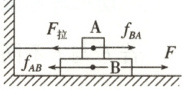 跟踪训练2:如图所示,A、B叠放在一起,用绳将A与墙相连,用力$F$拉着B,使B向右移动,用$F_{拉}$、$f_{AB}$、$f_{BA}$分别表示绳子的拉力、A对B的摩擦力和B对A的摩擦力,则