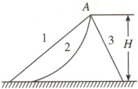 典题 2:如图所示,同一质量为 $ m $ 的物块分别沿三条不同的轨道由 $ A $ 点滑到同一水平面上,其中轨道 1 是粗糙的,轨道 2、3 是光滑的,$ A $ 离地面的竖直高度为 $ H $。下列说法正确的是(