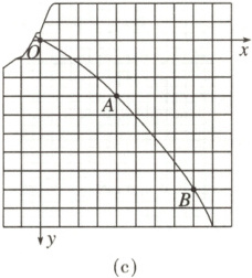 (3)乙同学不小心将记录实验的坐标纸弄破损,导致平抛运动的初始位置缺失。他选取轨迹中任意一点$O$为坐标原点,建立$xOy$坐标系($x$轴沿水平方向、$y$轴沿竖直方向),如图(c)所示。在轨迹中选取$A$、$B$两点,坐标纸中每个小方格的边长仍为$L$,重力加速度为$g$。由此可知:小球从$O$点运动到$A$点所用时间$t_{1}$与从$A$点运动到$B$点所用时间$t_{2}$的大小关系为:$t_{1}$