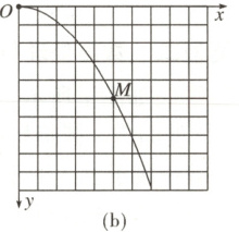 (2)甲同学按正确的操作完成实验并描绘出平抛运动的轨迹,以平抛运动的初始位置$O$为坐标原点建立$xOy$坐标系,如图(b)所示。从运动轨迹上选取多个点,根据其坐标值可以验证轨迹符合$y = ax^{2}$的抛物线。若坐标纸中每个小方格的边长为$L$,根据图中$M$点的坐标值,可以求出$a =$