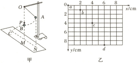 典题4:未来在一个未知星球上用如图甲所示装置研究平抛运动的规律。悬点$O$正下方$P$点处有水平放置的炽热电热丝,当悬线摆至电热丝处时能轻易被烧断,小球由于惯性向前飞出做平抛运动,现对小球采用频闪数码相机连续拍摄,在有坐标纸的背景屏前拍下了小球在做平抛运动过程中的多张照片,经合成后照片如图乙所示,$a$、$b$、$c$、$d$为连续四次拍下的小球位置,已知照相机连续拍照的时间间隔是$0.10s$,照片大小如图中坐标所示,又知该照片的长度与实际背景屏的长度之比为$1:4$,则: