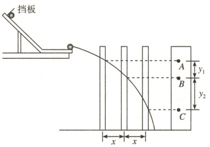 (3)因每次移动木板的水平距离相等,小球在水平方向做匀速直线运动,因此小球在水平方向经相等的距离所用时间T相等,小球在竖直方向做自由落体运动,所以在竖直方向则有Δy = gT²,即有y₂ - y₁ = gT²