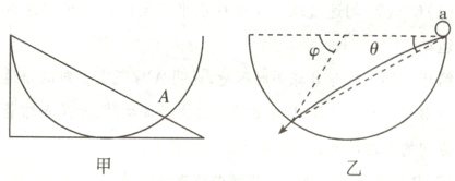跟踪训练4:D 将半圆轨道和斜面重合在一起,如图甲所示:设交点为 A,如果初速度合适,可使小球做平抛运动落在 A 点,则运动的时间相等,即同时落在半圆轨道和斜面上。b 球落在斜面上时,速度偏向角的正切值为位移偏向角正切值的 2 倍,即 $\tan \varphi_b = 2 \tan \theta_b = 2 × \frac{1}{2} = 1$,可得 $\varphi_b = 45°$,即 b 球的速度方向与水平方向成 $45°$ 角,此时 a 球落在半圆轨道上,a 球的速度方向与水平方向成 $45°$ 角,故两球的速度方向垂直,故 A 错误,D 正确;改变初速度的大小,b 球位移偏向角不变,因速度偏向角的正切值是位移偏向角正切值的 2 倍,故速度偏向角不变,b 球的速度方向和斜面的夹角不变,故 B 错误;若 a 球垂直撞在圆弧面上,如图乙所示:则此时 a 球的速度方向沿半径方向,且有 $\tan \varphi > 2 \tan \theta$,与平抛运动规律矛盾,a 球不可能垂直撞在半圆轨道上,故 C 错误。故选 D。