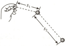 5.(2022·全国甲卷) 将一小球水平抛出,使用频闪仪和照相机对运动的小球进行拍摄,频闪仪每隔$0.05\ s$发出一次闪光。某次拍摄时,小球在抛出瞬间频闪仪恰好闪光,拍摄的照片编辑后如图所示。图中的第一个小球为抛出瞬间的影像,每相邻两个球之间被删去了3个影像,所标出的两个线段的长度$s_1$和$s_2$之比为$3:7$。重力加速度大小取$g = 10\ m/s^2$,忽略空气阻力。求在抛出瞬间小球速度的大小。