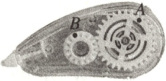 典题1:如图所示为学生使用的修正带,修正带的核心结构为咬合良好的两个齿轮,大、小齿轮的齿数之比$n_1:n_2 = k:1$。$A$、$B$两点分别位于大、小齿轮的边缘,当使用修正带时纸带的运动会带动两轮转动,则两轮转动时,$A$、$B$两点的 (