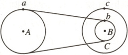 典题2:如图所示的传动装置中,$B$、$C$两轮固定在一起同轴转动,$A$、$B$两轮用皮带传动,三个轮的半径关系是$r_A = r_C = 2r_B$。若皮带不打滑,求$A$、$B$、$C$三轮边缘上$a$、$b$、$c$三点的角速度之比和线速度之比。