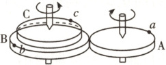跟踪训练2:如图所示,$B$和$C$是一组塔轮,即$B$和$C$半径不同,但固定在同一转动轴上,其半径之比为$R_B:R_C = 3:2$,$A$轮的半径大小与$C$轮相同,它与$B$轮紧靠在一起,当$A$轮绕过其中心的竖直轴转动时,由于摩擦作用,$B$轮也随之无相对滑动地转动起来。$a$、$b$、$c$分别为三轮边缘的三个点,则$a$、$b$、$c$三点在运动过程中的 (