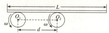 3. 如图所示,两个轮子的半径均为$R$,两轮的转轴$O_1$、$O_2$在同一水平面上,相互平行,相距为$d$,两轮均以角速度$\omega$逆时针方向匀速转动。将一长木板置于两轮上,当木板的重心位于右轮正上方时,木板与两轮间已不再有相对滑动。若木板的长度$L > 2d$,则木板的重心由右轮正上方移到左轮正上方所需的时间是 (